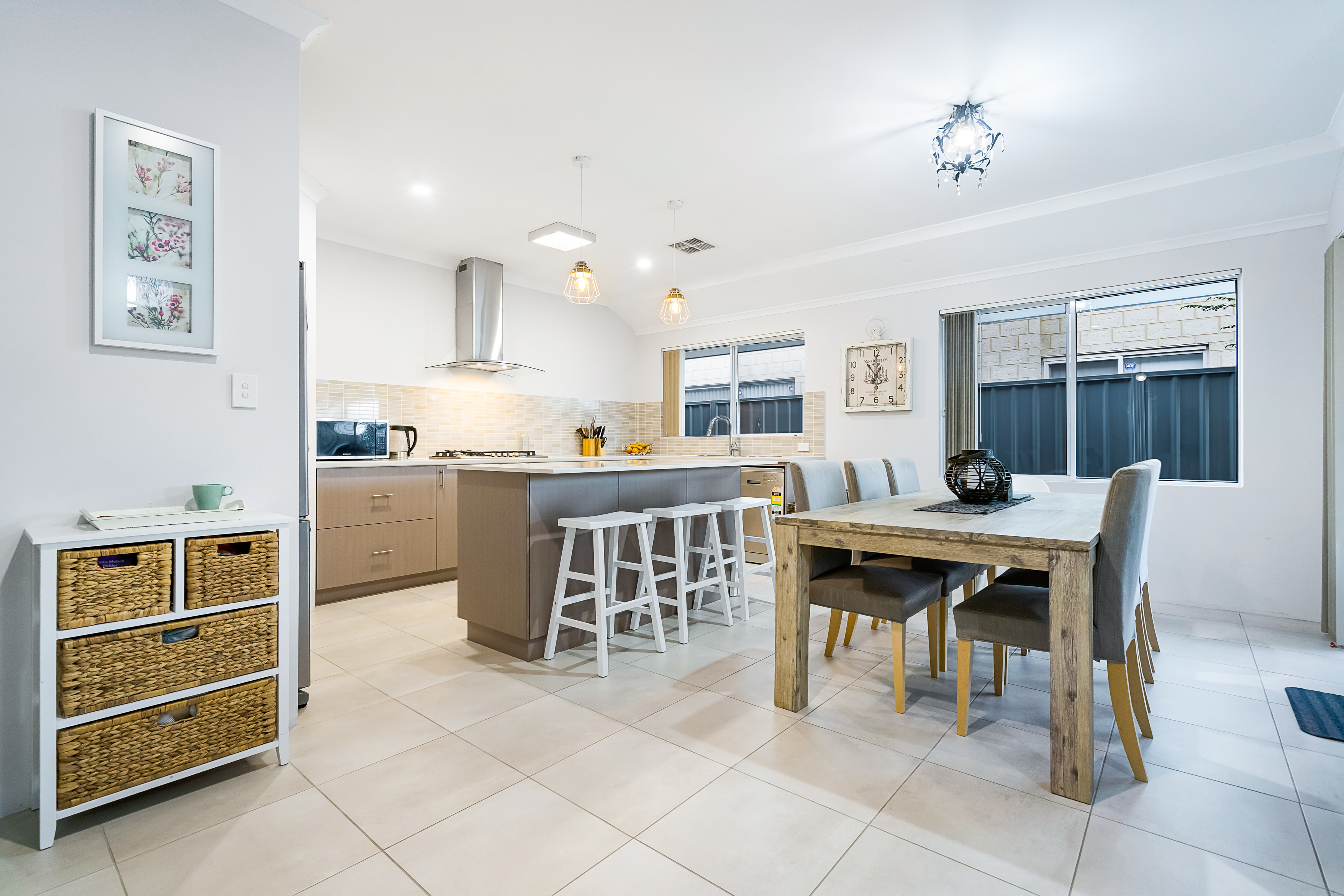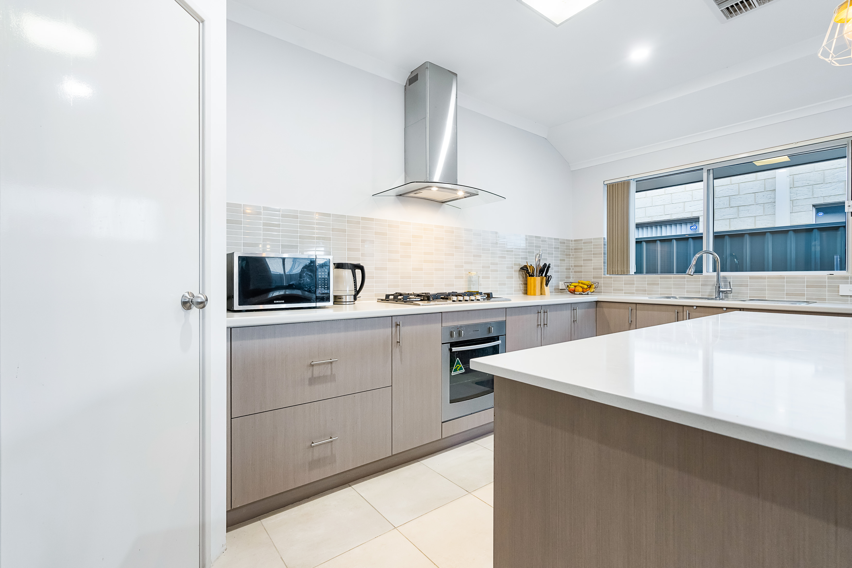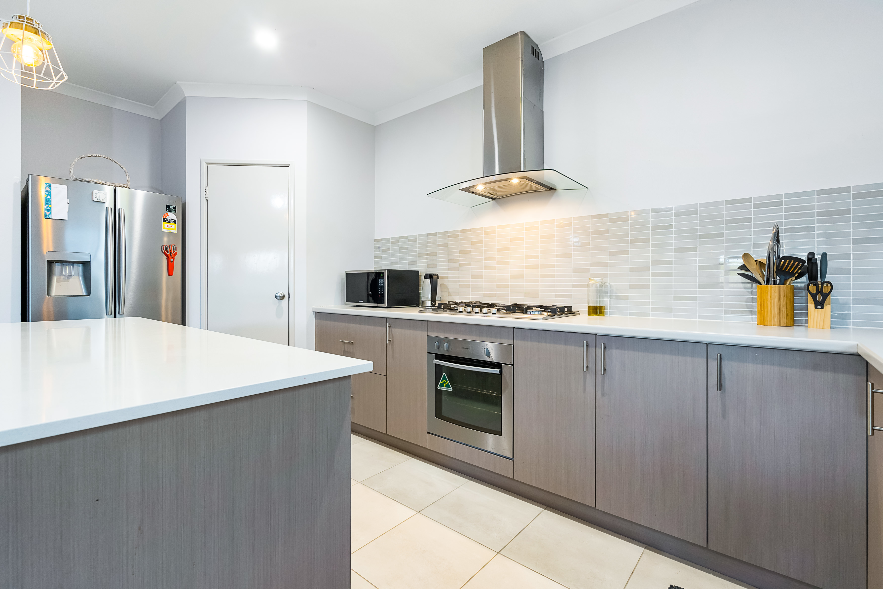 • Large chef’s kitchen with stone island bench top, L-shaped cupboards, walk-in pantry and stainless-steel appliances